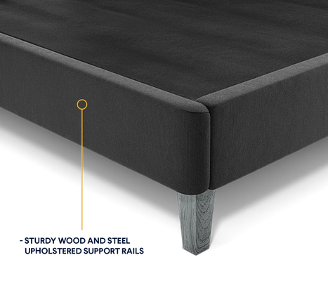 The Platform Base raises the bar for mattress support. Crafted with wood and steel, the upholstered head, foot, and side support rails measure 7 inches tall. They stabilize the mattress and give your sleep setup a finished look. Meanwhile, the center support rail provides structure, strength, and deep support. Finally, the 6-inch wood-style legs add elevation and elegance to this sturdy base.