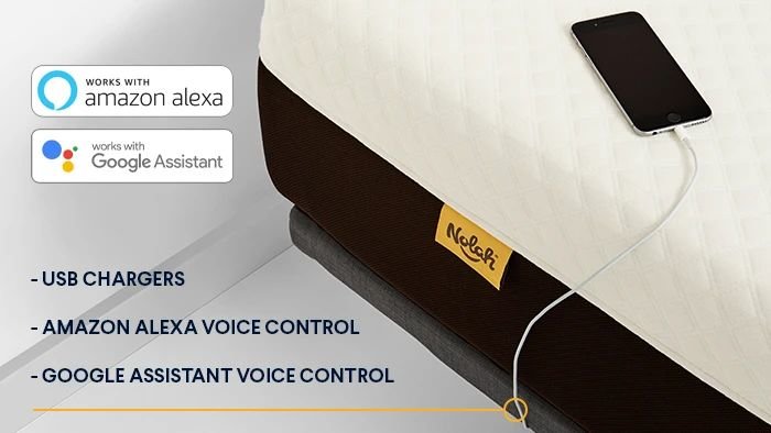 With head and foot elevation, the Nolah Smart Adjustable Base lets you find the perfect position for sleep or relaxation. Choose from pre-set configurations for back pain relief, anti-snoring, and increased circulation, or create and save your own. For couples who choose the split king, you can independently adjust the left and right sides of the bed for custom comfort. Change the frame's position with the wireless remote or voice commands through the built-in mic.